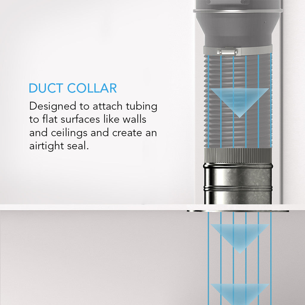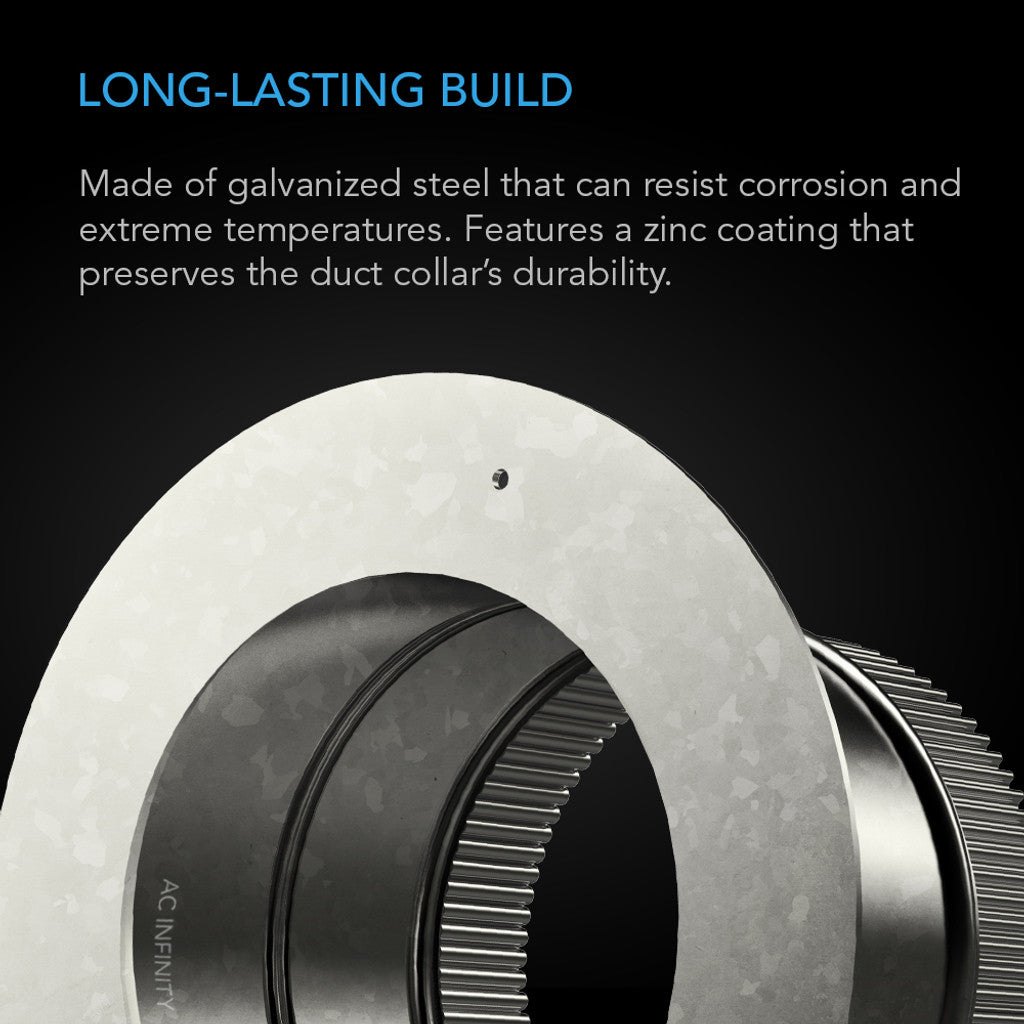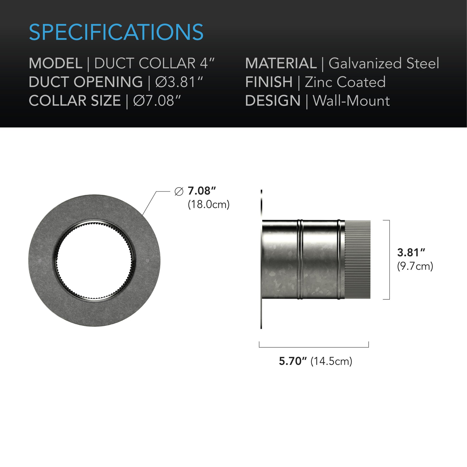 A ventilation retrofitting accessory designed to connect ducting to flat surfaces and redirect exhaust to the outside. Each duct collar is made of galvanized steel that can weather extreme temperatures and is finished with a corrosion-resistant zinc coating. Its pipe ending features fluted and ridged rims with a raised lip that provides a strong grip on flexible or rigid ducting. The collar end is flat and will lay flush against any flat surface including ceilings, walls, and floors. This ensures an airtight seal that will keep particles out and exhaust flowing one way.