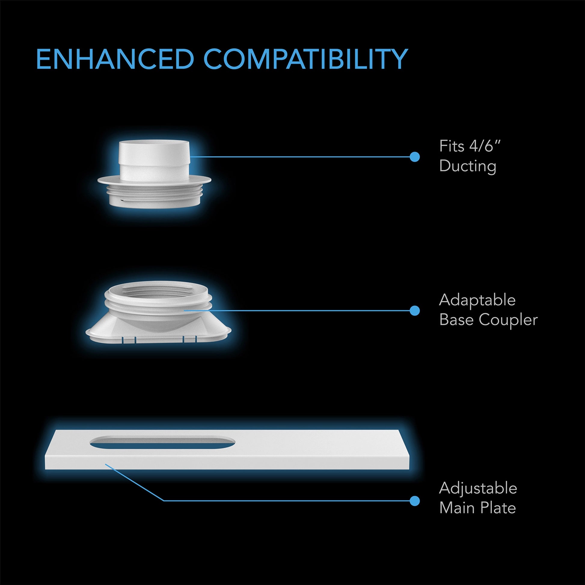 Plusieurs adaptateurs de conduit peuvent se fixer efficacement sur le coupleur de base hautement compatible pour s'associer en douceur aux tuyaux de conduits et de climatisation standard de l'industrie.