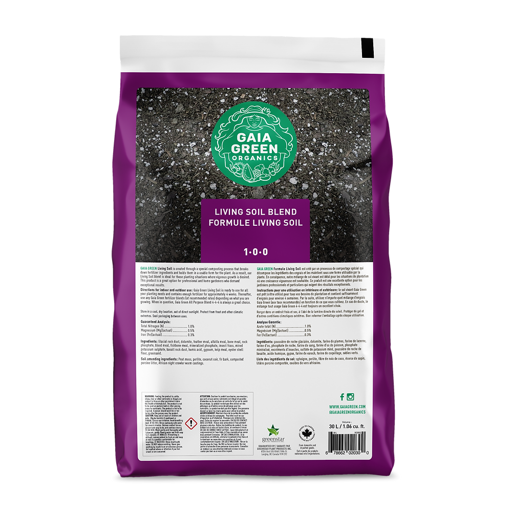 GAIAGREEN Living Soil est un mélange exclusif d'ingrédients de première qualité conçu pour créer un environnement racinaire optimal et soutenir l'activité microbienne bénéfique. Préchargé avec des engrais organiques à libération lente, Gaia Living Soil est le terreau de choix pour les producteurs exigeants qui adoptent une approche holistique et écologique de la culture de plantes en pot.