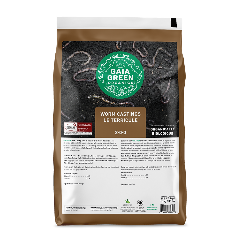 Les Gaia Green Worm Castings sont le fumier non transformé des vers de terre. Cet engrais tout usage est riche en matière organique et ajoute des nutriments essentiels au sol pour favoriser une forte croissance des plantes. Appliquer comme top dressing, side dressing ou travailler dans le sol pour une croissance exceptionnelle. Recommandé pour les plantes domestiques, les jardins urbains, les pelouses, les terrains de golf, les pépinières et les serres.