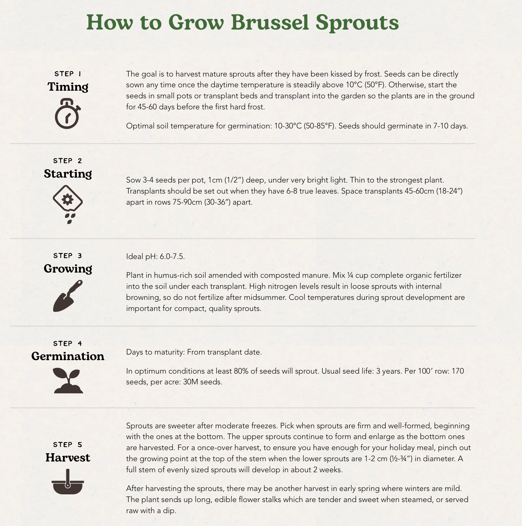 Ideal pH: 6.0-7.5. Plant in humus-rich soil amended with composted manure. Mix ¼ cup complete organic fertilizer into the soil under each transplant. High nitrogen levels result in loose sprouts with internal browning, so do not fertilize after midsummer. Cool temperatures during sprout development are important for compact, quality sprouts. |