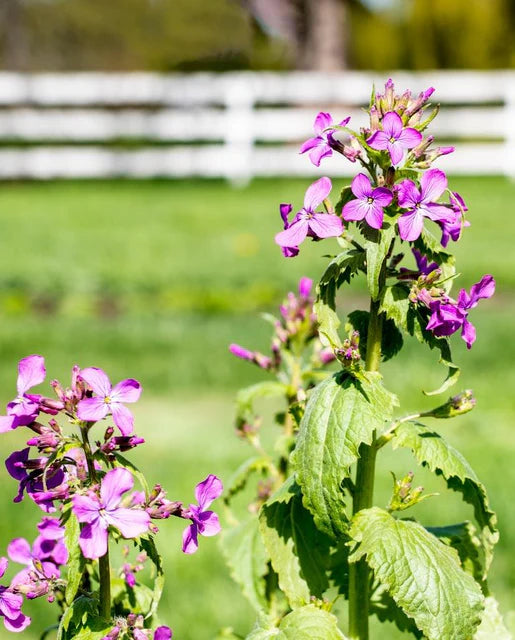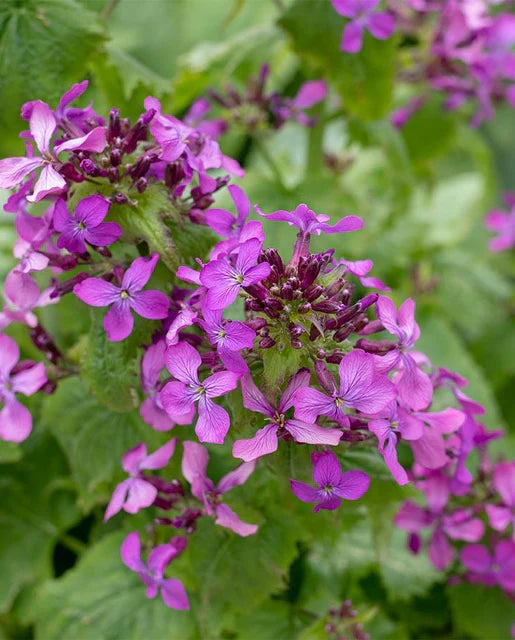 Lunaria annua. Brought to America by Puritans, this old heirloom is also known by such colourful names as Judas' Penny and Moonwort. Plant Honesty Lunaria seeds in spring in sun or partial shade and enjoy mauve flowers, followed by distinctive papery seedpods. These start out flat, circular, and green, but become silvery white and paper-like as they mature, making excellent dried displays. The seeds are easy to harvest from within each pod for seed saving and sharing. Lunaria grows to about 90cm (35") tall, and makes a good mate for Foxgloves in shady areas of the garden.