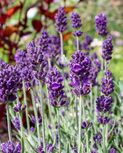 La croissance dressée de la lavande Lavance Deep Purple s'étend sur environ 30 cm et fleurit de la fin du printemps jusqu'à l'automne. Les abeilles semblent enivrées par ses fleurs violettes parfumées. Cette variété résiste à la sécheresse et peut supporter des températures estivales élevées. De plus, il résiste aux cerfs et aux lapins, ce qui le rend idéal pour les jardins côtiers.