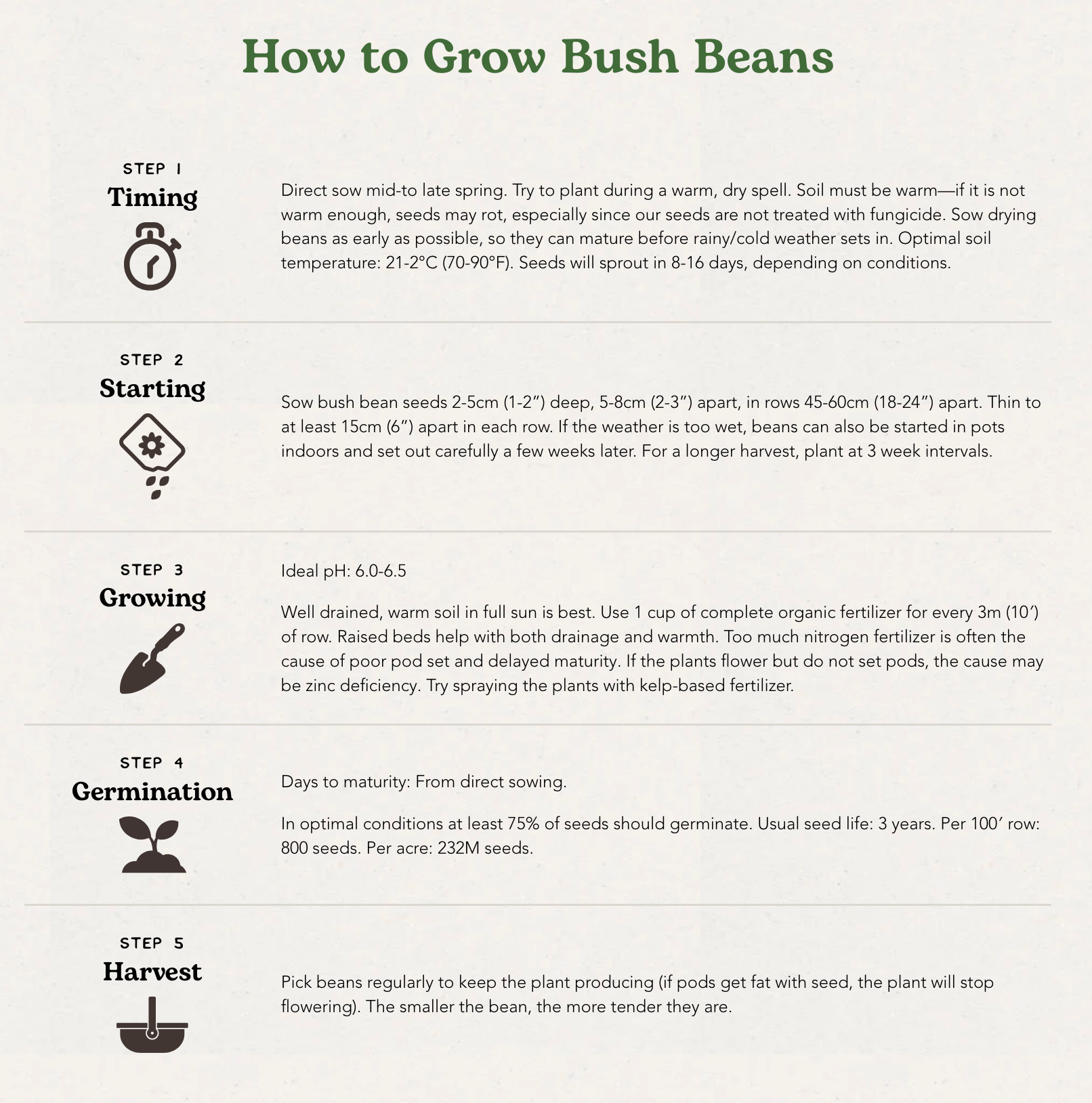 Ideal pH: 6.0-6.5. Well drained, warm soil in full sun is best. Raised beds help with both drainage and warmth. Use 1 cup of complete organic fertilizer for every 3m (10′) of row. Too much nitrogen fertilizer is often the cause of poor pod set and delayed maturity. If the plants flower but do not set pods, the cause may be zinc deficiency. Try spraying the plants with kelp-based fertilizer. Wet leaves on crowded plants are subject to diseases. Thin plants to increase air circulation and avoid touching the leaves while they are wet. |