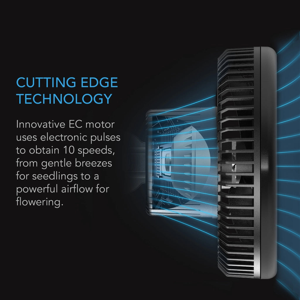 Utilizes a cutting-edge EC motor with PWM control to access a full range of fan speeds, from gentle breezes to a powerful airflow. The ten speed levels are shown with a circular LED display that dims after fan speed is set to leave your plant's light cycle undisturbed!