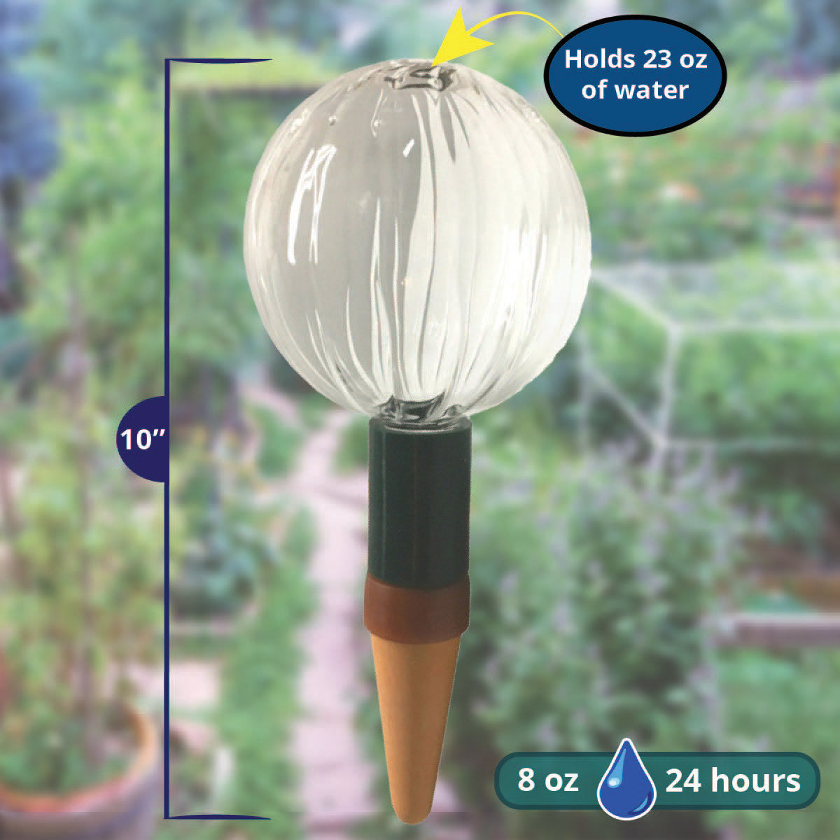 Just push the adapter and glass globe into your potting mix, fill it with water, and watch how fast your plants grow! The porous cone will slowly start to distribute water throughout the day. The regular size does about 200 milileters (.43 pint) during a 24-hour period. The XL, larger size does about 300 milileters (.63 pint).