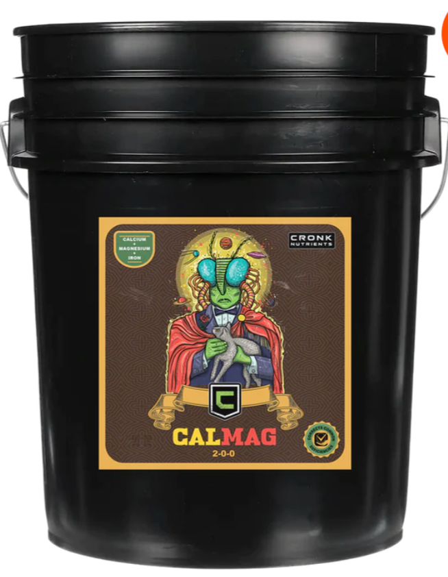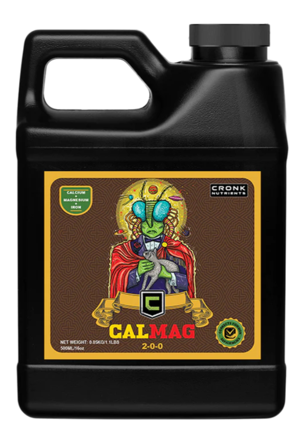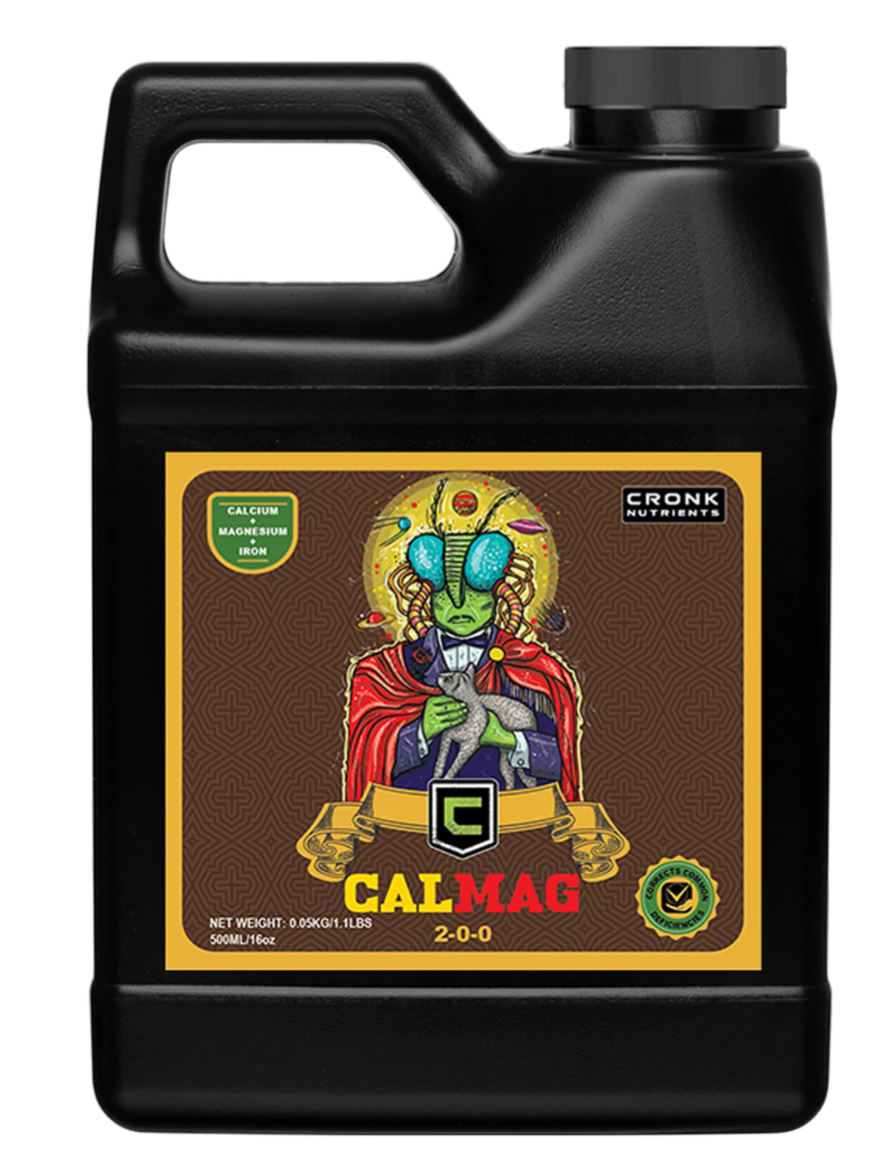 Cronk Grow Nutrients CalMag 2-0-0, is a concentrated combination of readily available calcium and magnesium that are critical throughout all stages of growth. Use as part of your regular feeding schedule to help prevent blossom end rot and tip burn in your “tomatoes”, lettuce, and other calcium intensive plants. CGN CalMag 2-0-0 is a soluble solution that will not clog hydroponic lines or any type of spear lines. It can be combined with any other of our nutrients in the Cronk Grow Nutrients™ line.