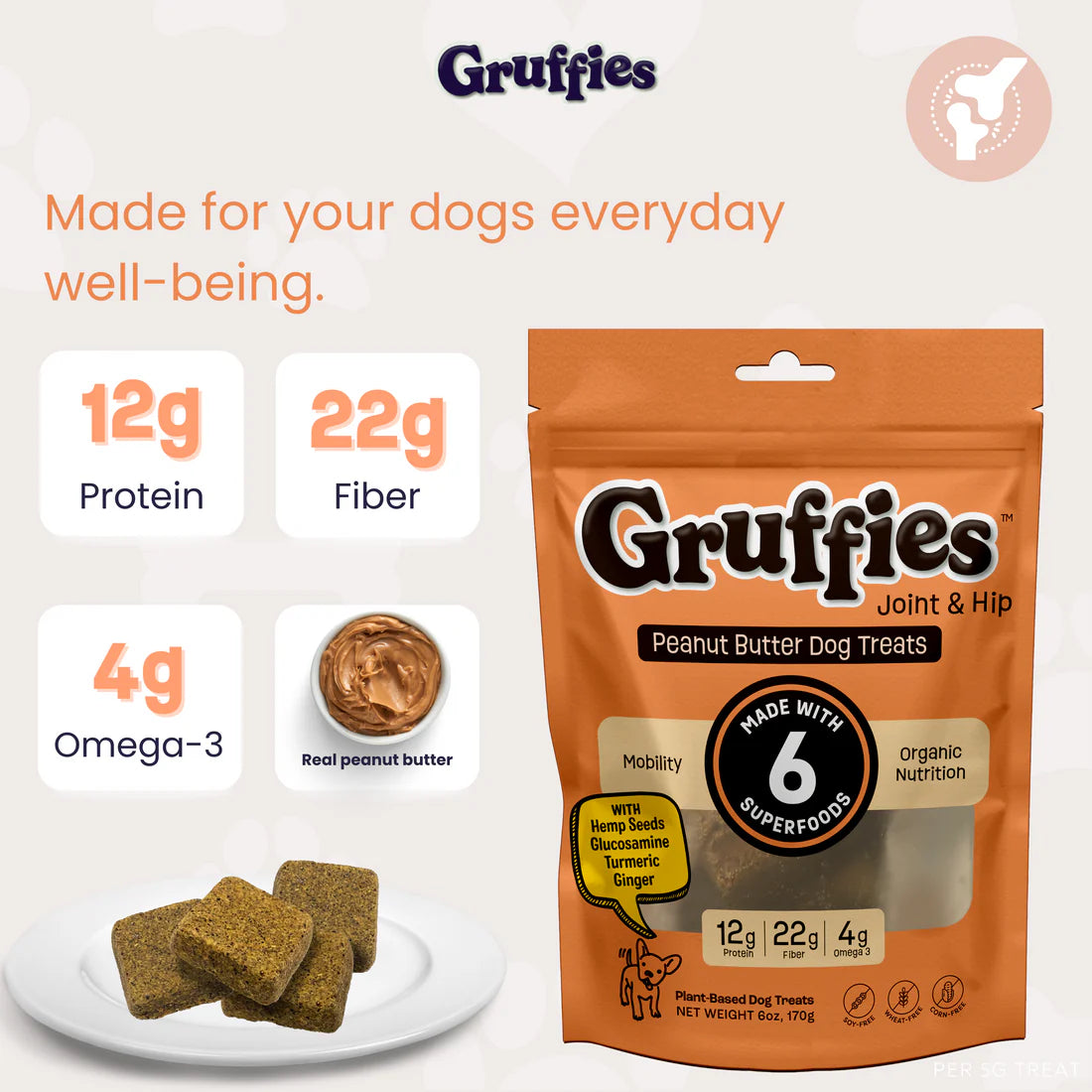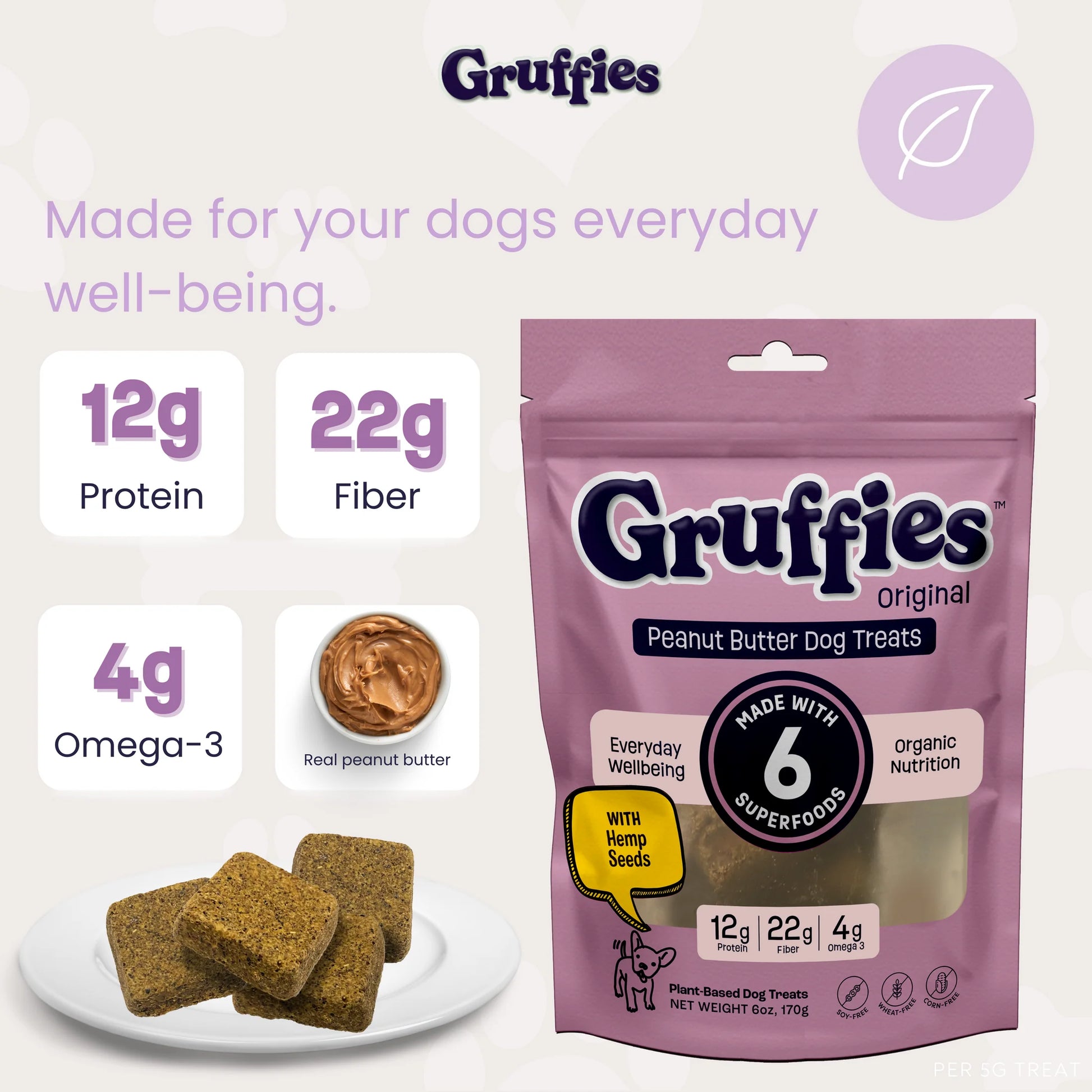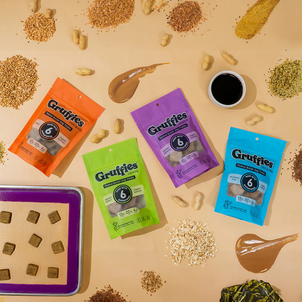 Gruffies dog treats are made with healthy, sustainable, & wholesome ingredients for a guilt-free treat that supports overall health. Our blend of six superfoods, including organic peanut butter, hemp hearts, flax, barley, oats, and molasses, delivers essential nutrition like protein, fiber, and omegas. Gruffies combines great taste with health benefits, making them the ideal treat for dogs of any size or age. Treat your dog to Gruffies and promote a happier, healthier life!