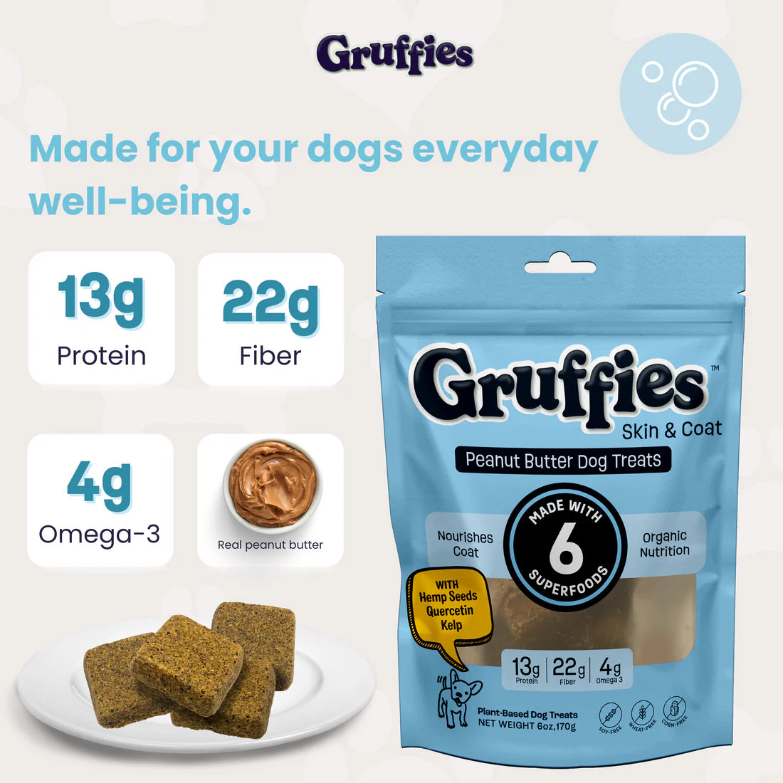 - Health Benefits: Gruffies skin and coat support supplement treats alleviate sensitive skin and seasonal allergies. They promote a shiny coat for your pet's well-being and beauty.