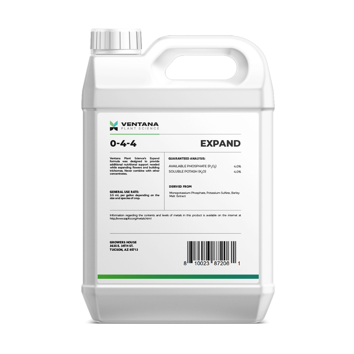 Ventana Plant Science Expand formula was designed to provide additional nutritional support needed while expanding flowers and building trichomes!