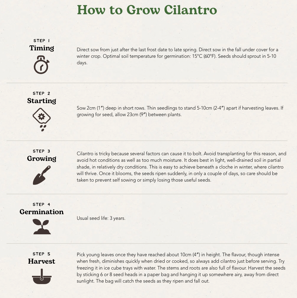 TIPS: Cilantro is tricky because several factors can cause it to bolt. Avoid transplanting for this reason, and avoid hot conditions as well as too much moisture. It does best in light, well-drained soil in partial shade, in relatively dry conditions. This is easy to achieve beneath a cloche in winter, where cilantro will thrive. Once it blooms, the seeds ripen suddenly, in only a couple of days, so care should be taken to prevent self sowing or simply losing those useful seeds.