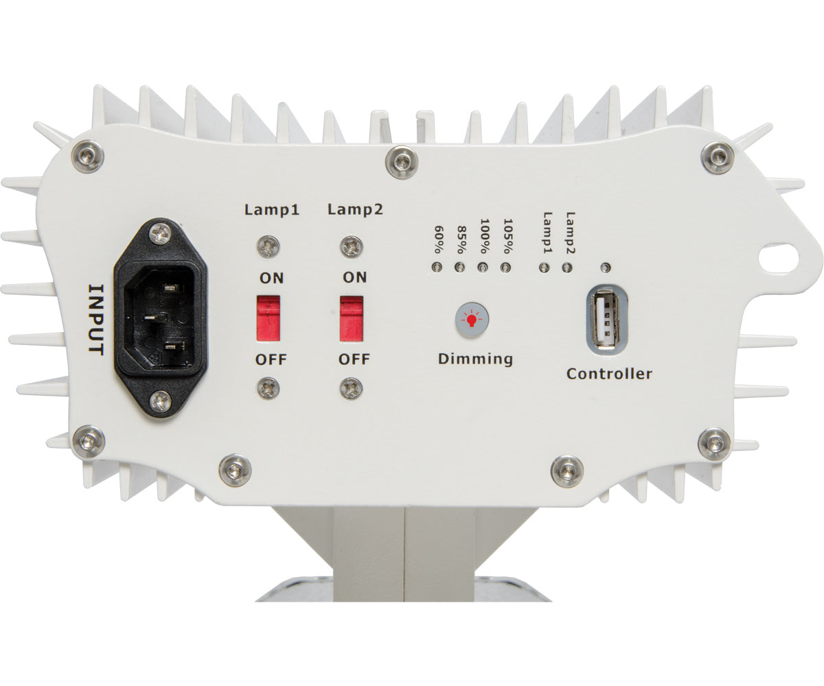 附带的 Phantom Dual CMH 高压镇流器采用低频方波技术,安静、可靠且节能。它有一个 USB 端口,用于 PX1 控制器兼容性和调光选项。如果需要,还可以设置四个成角度的反射器位置。输入电压选项有 277-347V、277V 和 347V。 PHMH6020NL 商品的灯单独出售。