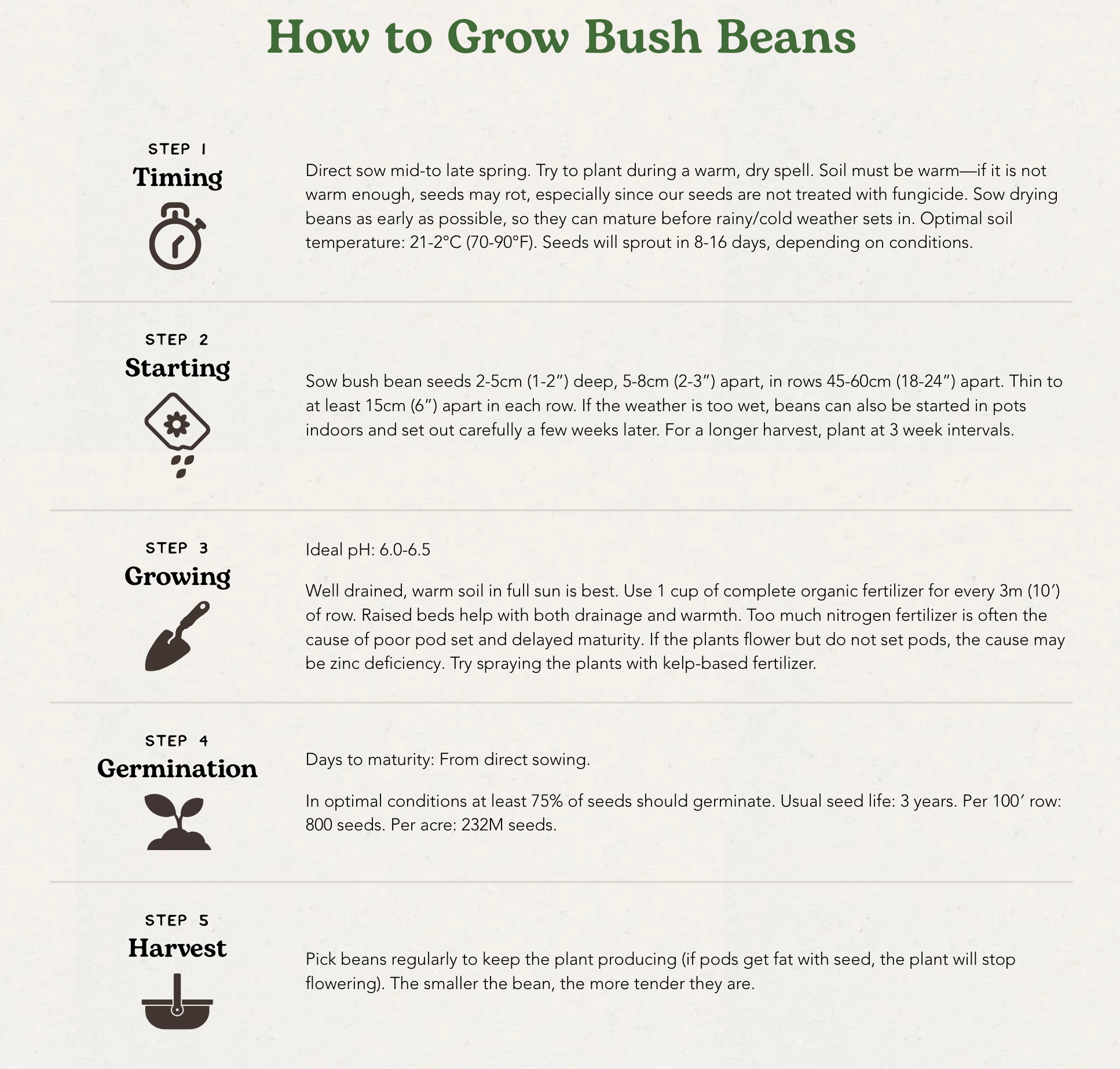 | Starting | Sow seeds 2-5cm (1-2″) deep, 5-8cm (2-3″) apart, in rows 45-60cm (18-24″) apart. Thin to at least 15cm (6″) apart in each row. If the weather is too wet, beans can also be started in pots indoors and set out carefully a few weeks later. For a continuous harvest, plant at 3 week intervals. |