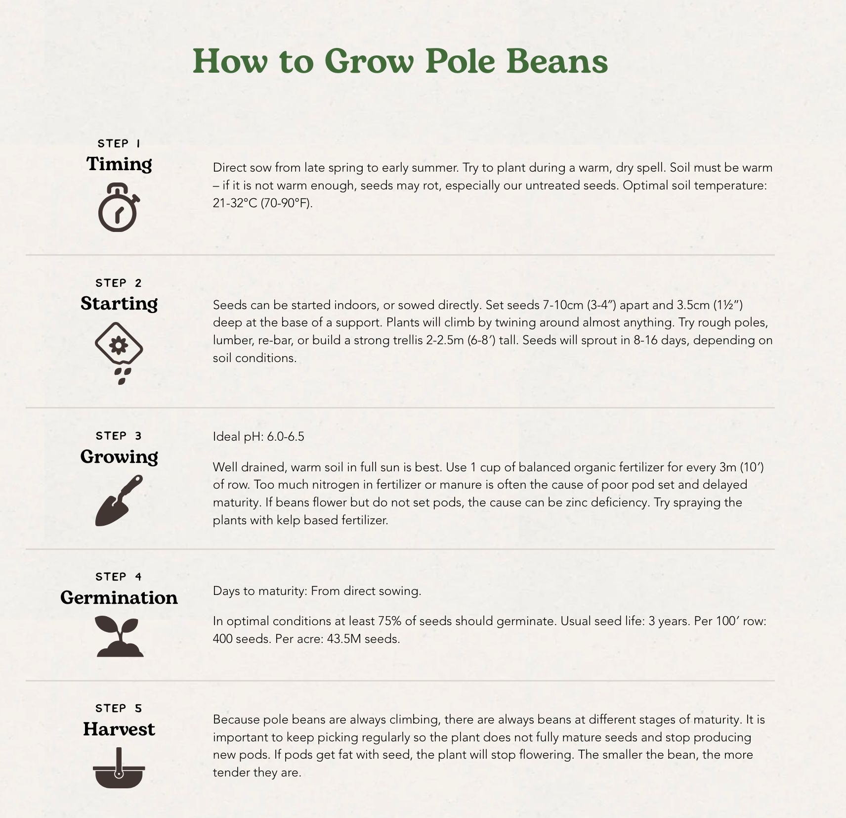 | Growing | Ideal pH: 6.0-6.5. Well drained, warm soil in full sun is best. Use 1 cup of balanced organic fertilizer for every 3m (10′) of row. Too much nitrogen in fertilizer or manure is often the cause of poor pod set and delayed maturity. If beans flower but do not set pods, the cause can be zinc deficiency. Try spraying the plants with kelp based fertilizer. Wet leaves on crowded plants are subject to diseases. Thin plants to increase air circulation and avoid touching the leaves while they are wet. |