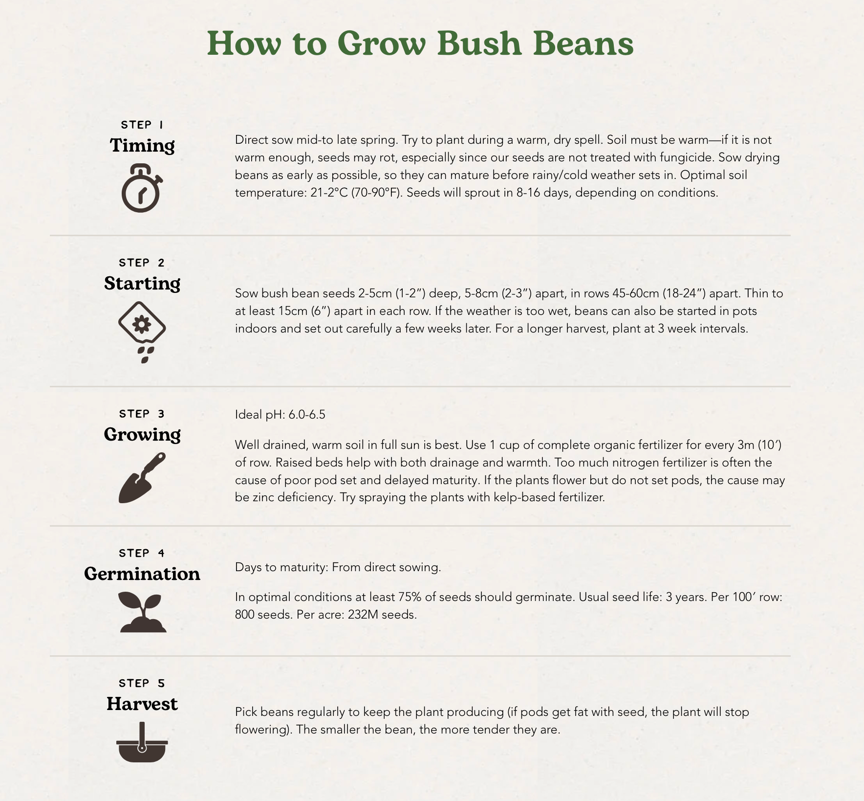 Ideal pH: 6.0-6.5. Well drained, warm soil in full sun is best. Raised beds help with both drainage and warmth. Use 1 cup of complete organic fertilizer for every 3m (10′) of row. Too much nitrogen fertilizer is often the cause of poor pod set and delayed maturity. If the plants flower but do not set pods, the cause may be zinc deficiency. Try spraying the plants with kelp-based fertilizer. Wet leaves on crowded plants are subject to diseases. Thin plants to increase air circulation and avoid touching the leaves while they are wet. |
