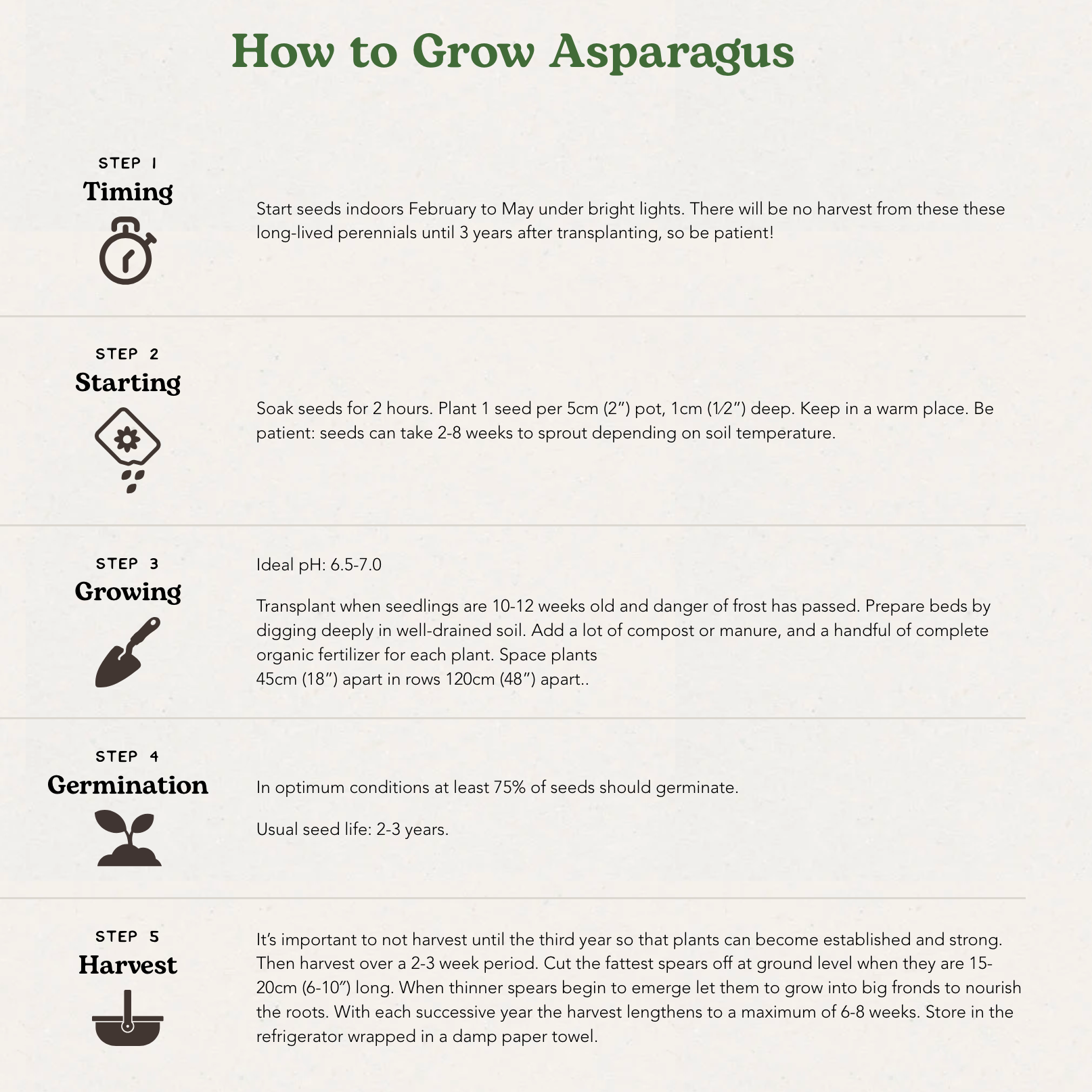 Transplant when seedlings are 10-12 weeks old and danger of frost has passed. Space 45cm (18″) apart in rows 1-2m (3-6′) apart. Transplant each plant in a hole 10cm (4") deep and gradually cover the crown with soil as it grows. For thicker spears, space 30-35cm (12-14″) apart and set buds 15-20cm (6-8″) in the hole. For thinner spears, space 20-25cm (8-10″) with the buds 10cm (4″) deep.Fertilize after harvest and again in the spring with 1-2 cups of complete organic fertilizer per 3m (10′) of row, worked in lightly. Asparagus needs 2cm (1″) of water per week. In late fall, trim ferns down to 5cm (2″) and dispose of cuttings to avoid future disease and insect problems. |